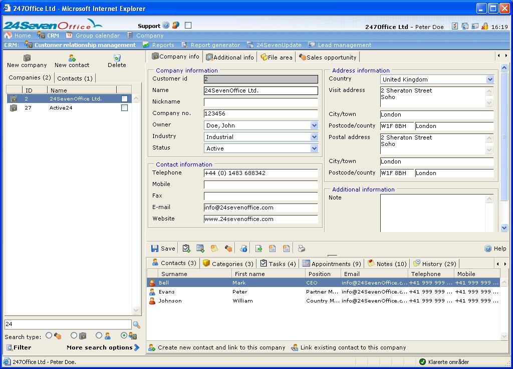 Unlike standalone contact managers that isolate customer information on individual desktops, 24SevenOffice CRM provides a common, shared system for customer information. Everyone can view, update, and share information, activities, and appointments in real time from any computer connected to the Internet. With 24SevenOffice CRM there is no need for installation, upgrades, servers, or worry about backup of data.